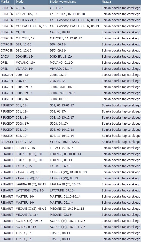 | Оригинальный каталожный номер: | 4401109, 7703077476, 9345ZN, 95508766, KOŁKI TAPICERKI, MOCOWANIE TAPICERKI, SPINKI BOCZKI DRZWI TAPICERKI, SPINKI TAPICERKI |
