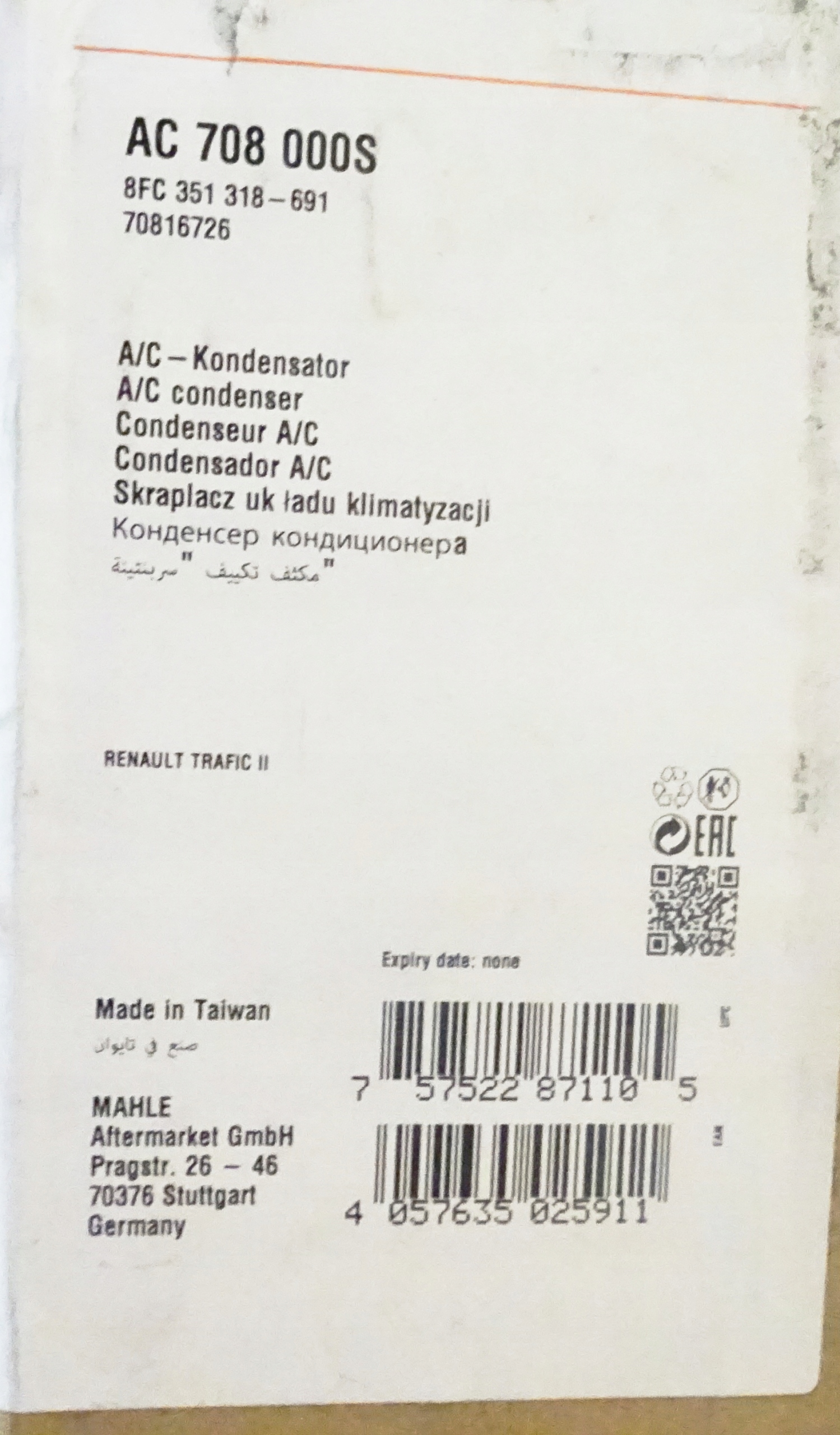 Есть ли гарантия на Радиатор кондиционера mahle knecht ac708000s?