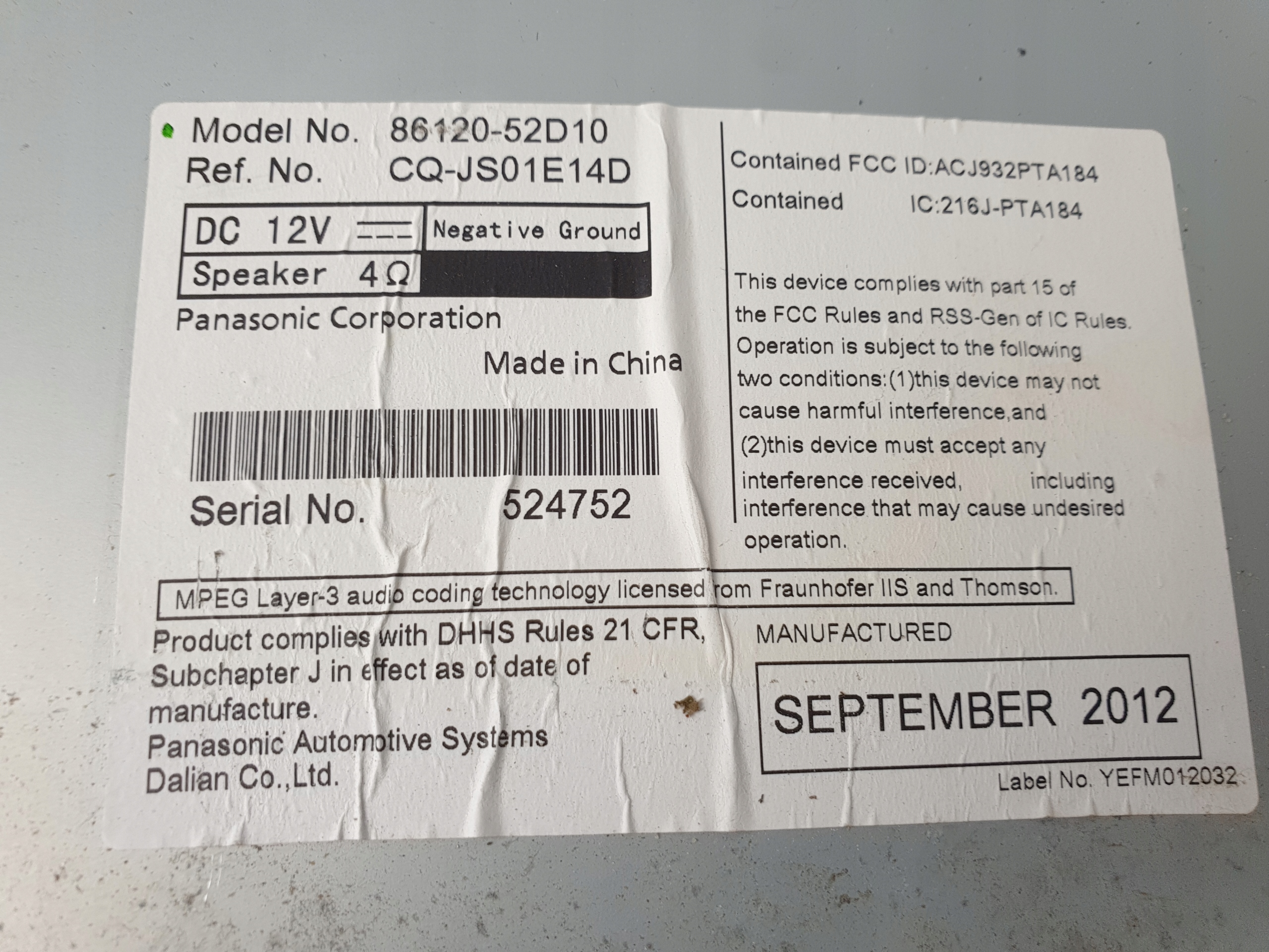 | Каталожный номер детали: | 86120-52D10 |