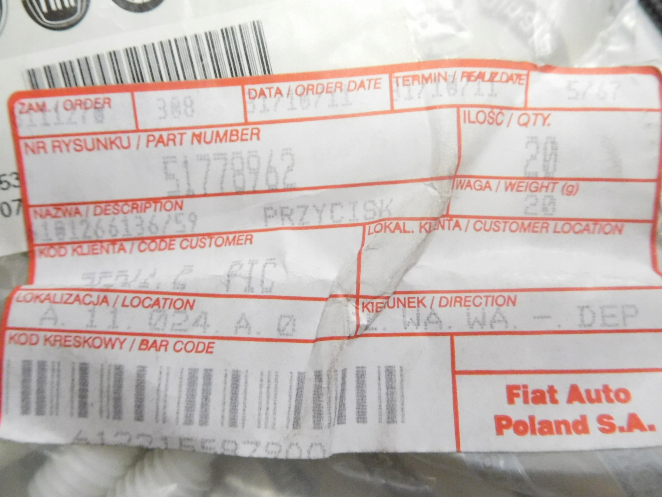 | Каталожный номер детали: | 51778962 |