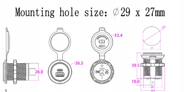 Зарядное устройство usb автомобильная pd qc3.0 монтажная 12v 24v ip65 led niebieski