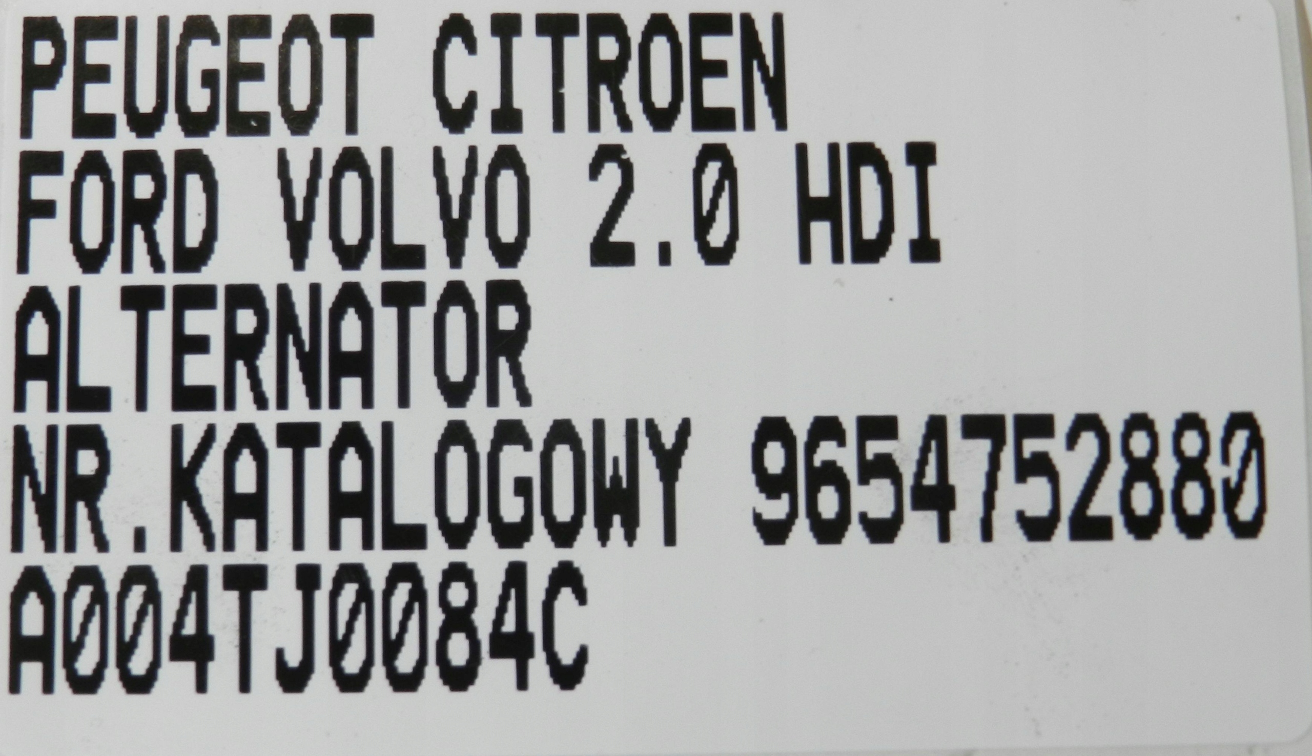 Каталожный номер детали: ALTERNATOR, PEUGEOT, CITROEN, 2.0, HDI, 9654752880, A004TJ0084C