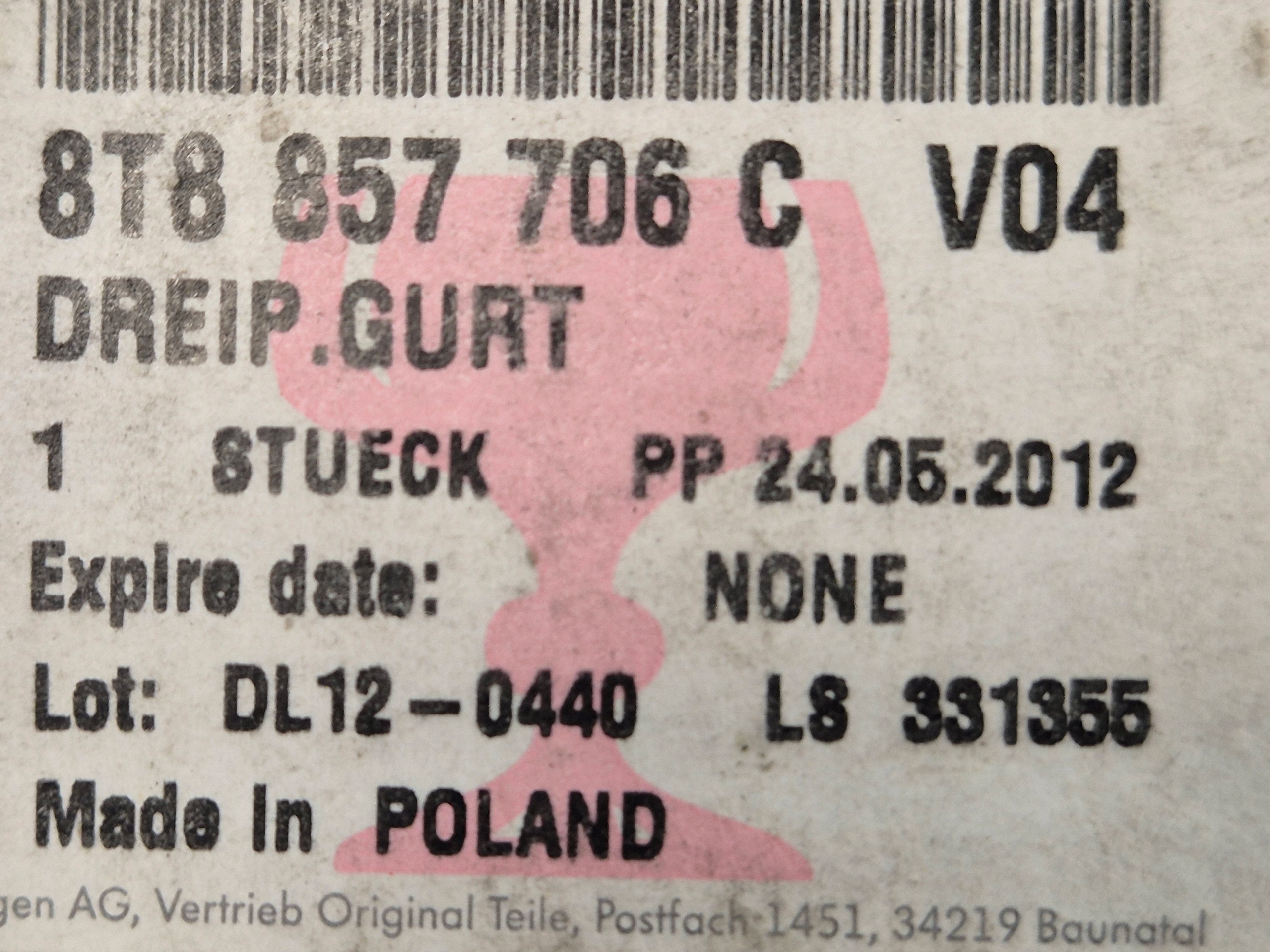 Есть ли гарантия на Audi a5 trzy punktowy ремень безопасности перед правый оригинальный номер 8t8857706c v04?