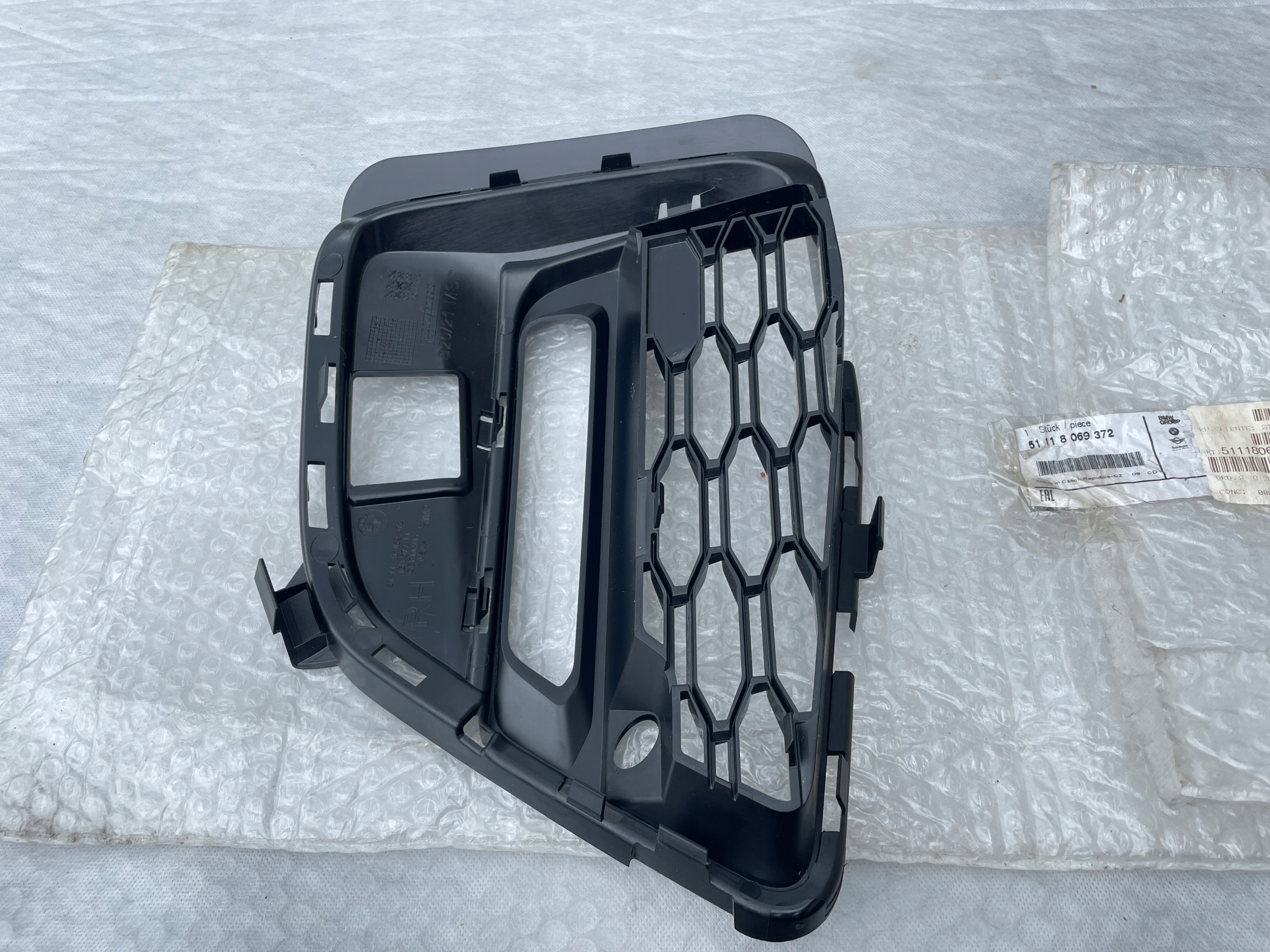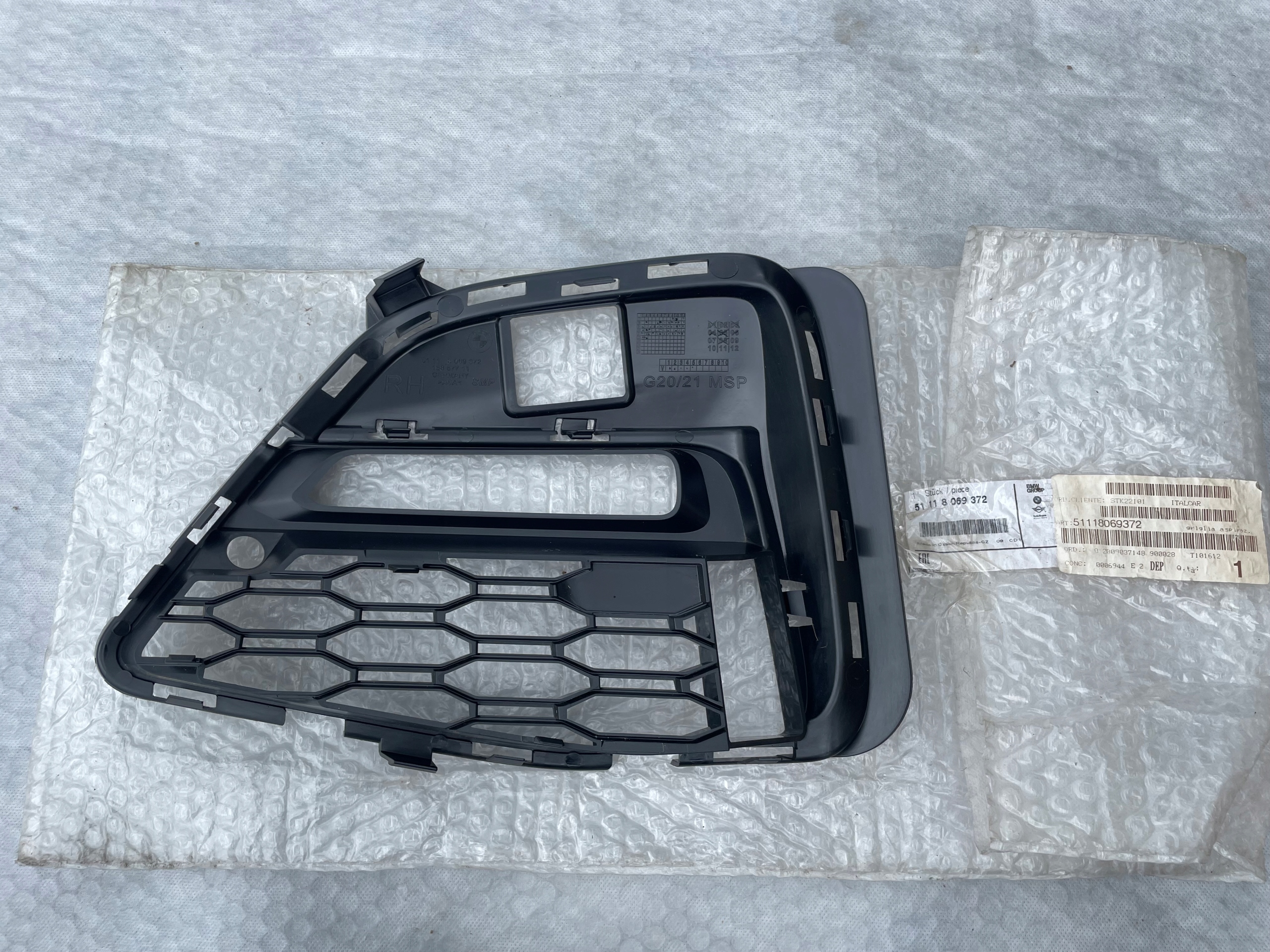 Каталожный номер детали: 51118069372, 51, 11, 8, 069, 372, 15857711, BMW, Seria, 3, G20, G21, M, grill, atrapa, zaślepka, siatka, kratka, w, zderzak, prawa, zderzaka, rh, przednia, przedniego, przodu