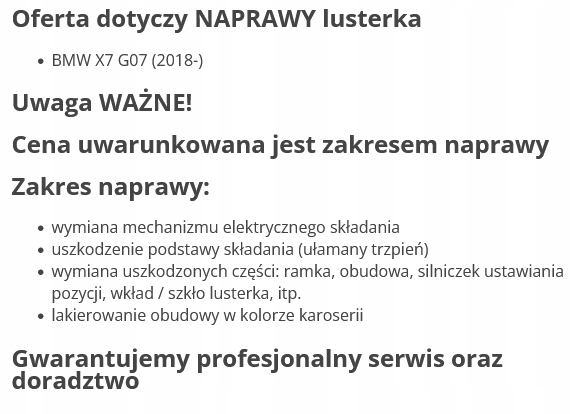 | Каталожный номер детали: | BMW X7 G07 NAPRAWA LUSTERKA |