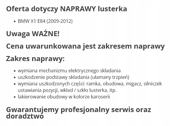 | Каталожний номер деталі: | BMW X1 E84 lift (12-15) NAPRAWA LUSTERKA PRAWE |