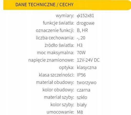 | Źródło світло: | tradycyjne / галогенні |