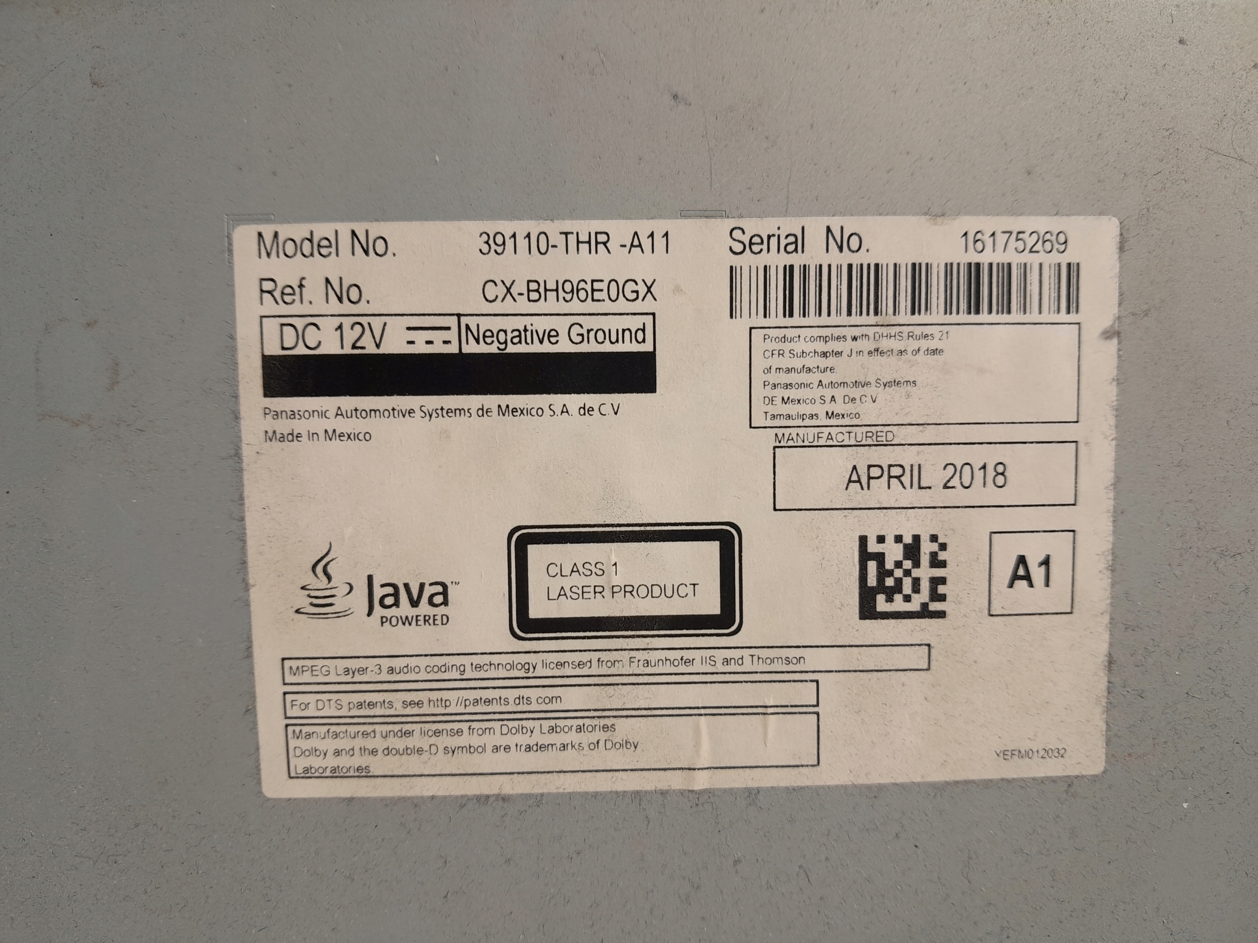 Honda odyssey v 18- зчитувач dvd blu-ray-disc 39110-thr-a11