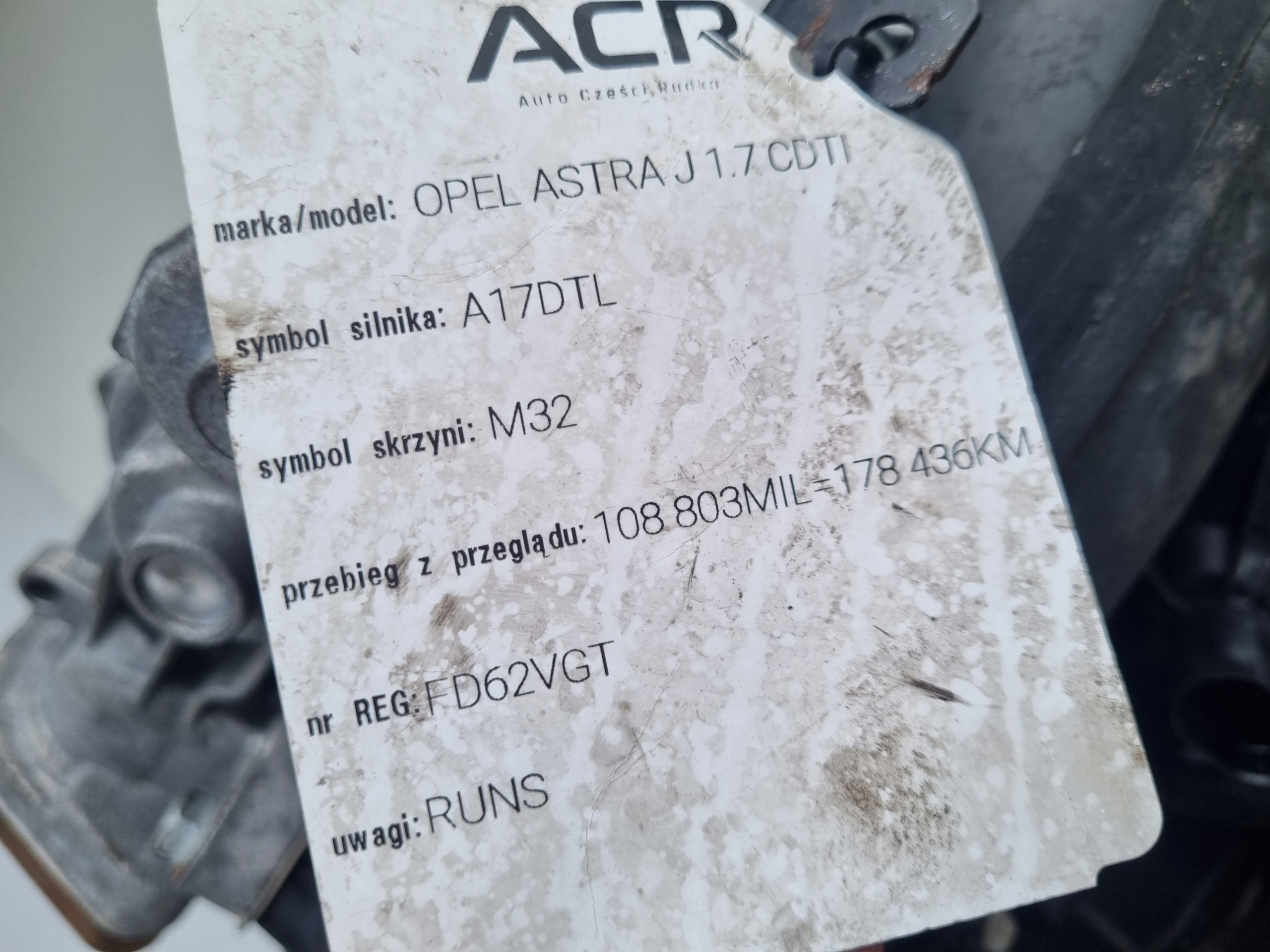 Двигун opel astra iv j 1.7 cdti 110km udokumentowany 178tyś a17dte