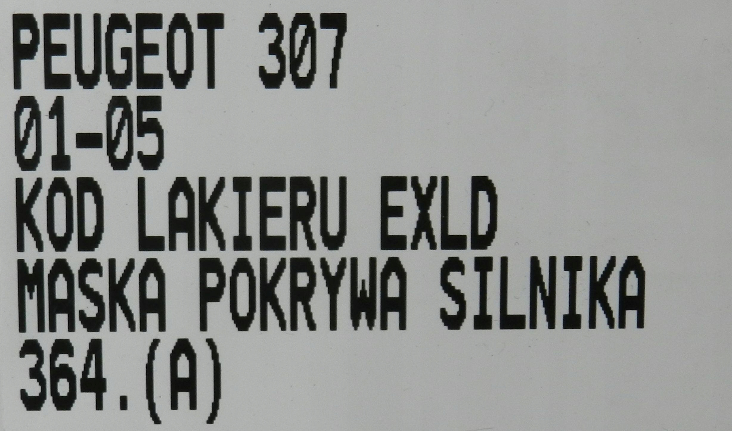 | Каталожний номер деталі: | PEUGEOT, 307, 01-05, MASKA, POKRYWA, SILNIKA, LAKIER, EXLD |