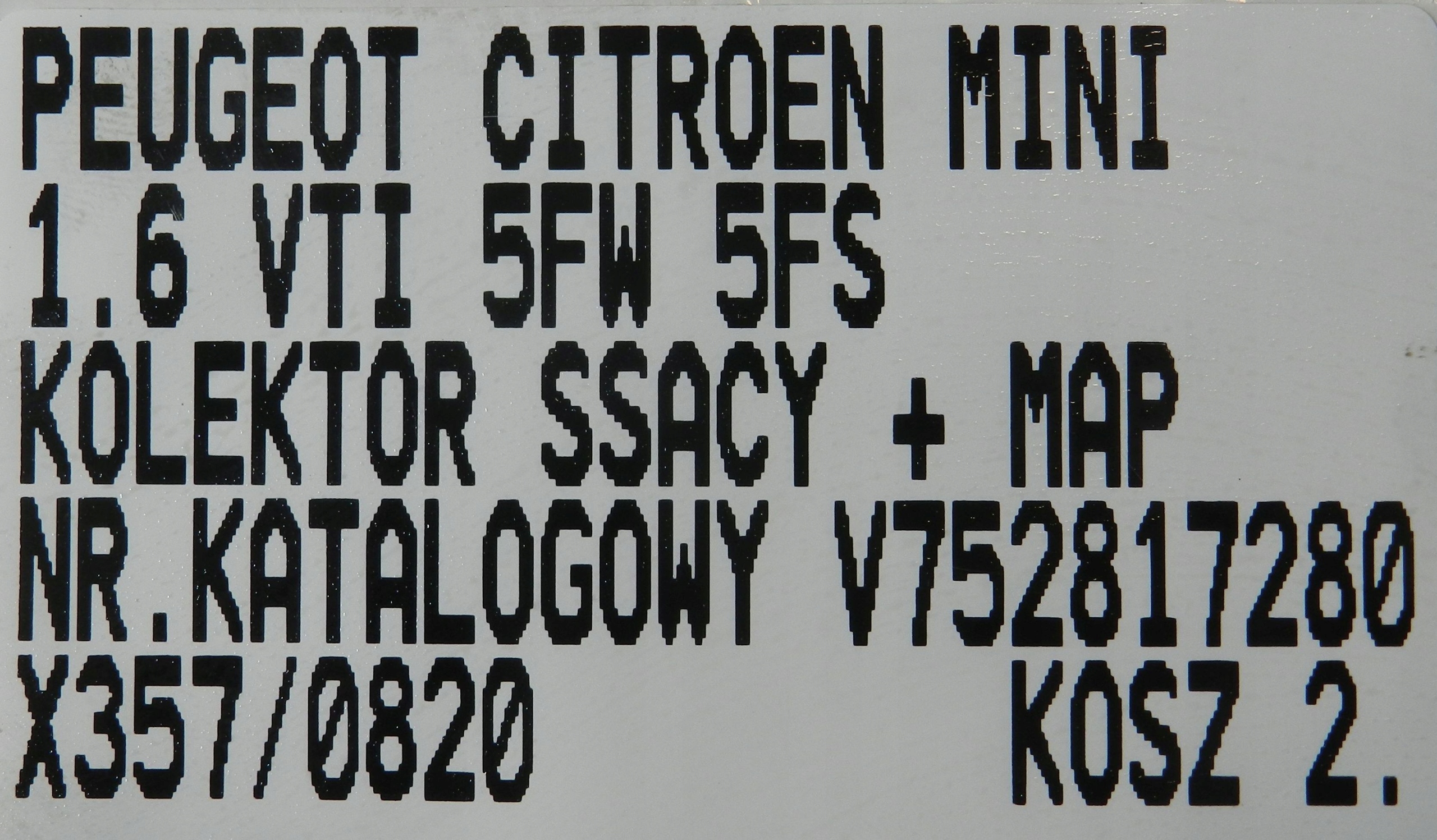 Каталожний номер деталі: KOLEKTOR, SSĄCY+, MAP, SENSOR, PEUGEOT, CITROEN, MINI, 1.6, VTI, 5FW, 5FS, V752817280, 0261230136